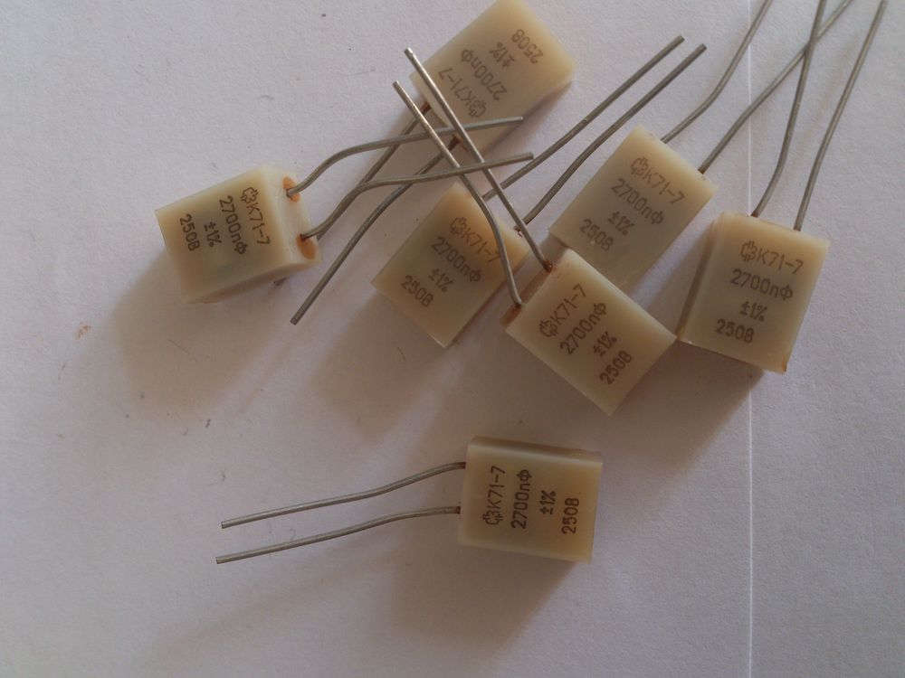 К71-7 250В 2700пф+-2% конденсатор постоянной ёмкости на основе полистирольной плёнки, герметизированный прецизионные. Предназначен для работы в цепях постоянного, переменного, пульсирующего токов и в импульсных режимах.