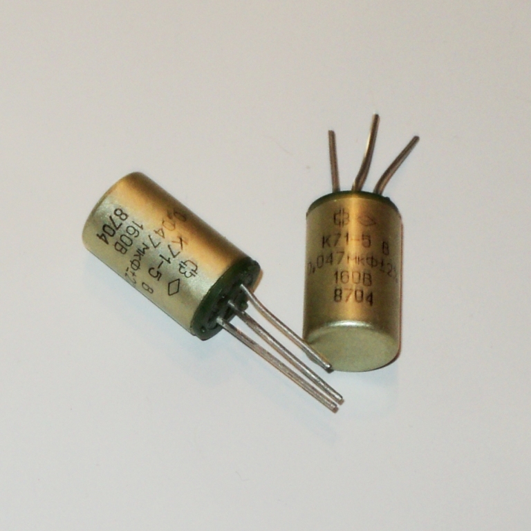 К71-5 160В 0,047мкф конденсатор полистирольный металлизированный уплотненный в цилиндрическом металлическом корпусе с однонаправленными выводами с заливкой эпоксидным компаундом, однослойные. Используются для работы в цепях постоянного, переменного, пульсирующего тока и в импульсных режимах. Предназначены для печатного монтажа.