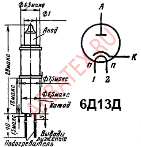 6Д13Д диод сверхвысокочастотный для детектирования и выпрямления в схемах электронных вольтметров и других радиотехнических устройствах в сантиметровом диапазоне. относится к разделу электровакуумных приборов и ламп различного назначения. По конструкции состоит из вакуумно-герметичной, жесткой оболочки, внутри которой отсутствует кислород.