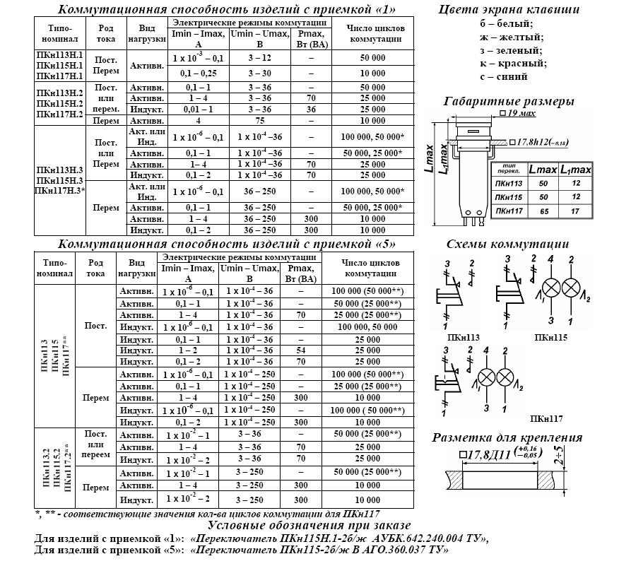 ПКН115-3б/жВ переключатель кнопочный, в том числе со световой индикацией и фиксацией, применяется для коммутации электрических цепей постоянного и переменного тока в радиоэлектронной аппаратуре. Климатическое исполнение В. Переключатели могут изготавливаться с тремя конструктивными исполнениями кнопок: 1 - с одноцветным неразделенным цветовым и световым полем. 2 –двухцветным симметрично разделенным цветовым и световым полем. 3 –двухцветным несимметрично разделенным цветовым и световым полем. Возможно различное сочетание полей.