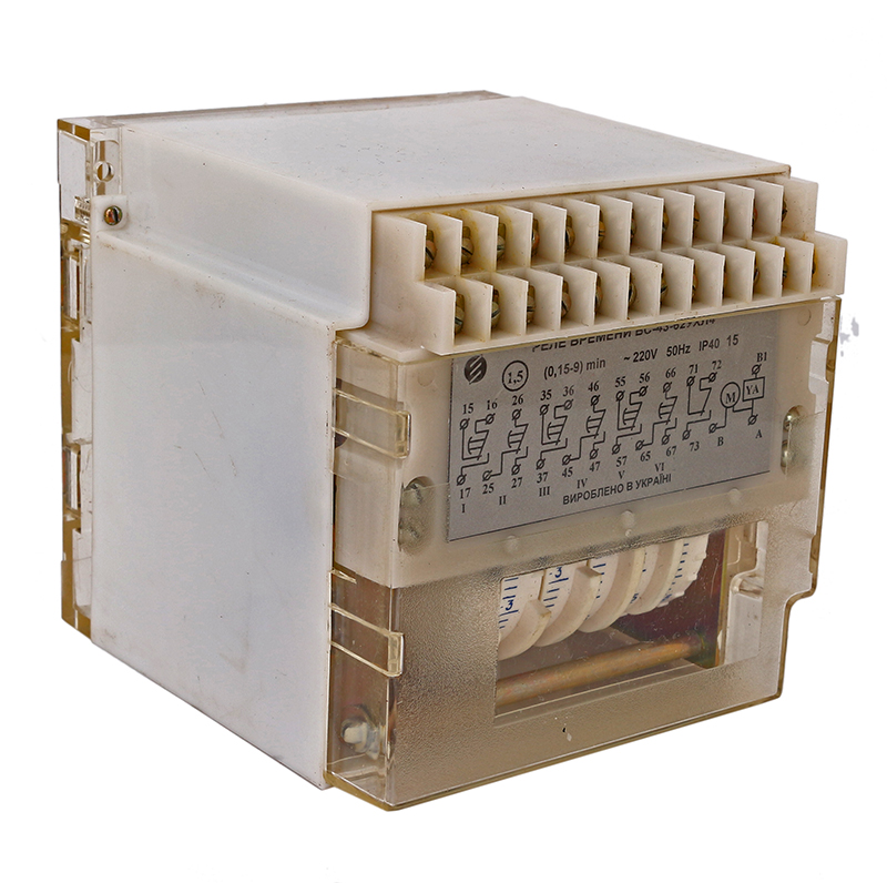 ВС-43-64УХЛ4 0.15-9ч 220В реле времени электромеханическое применяется для получения независимой выдержки времени. Реле времени применяется в схемах, где необходимо автоматически выполнить какое-то действие через определенный промежуток времени. Реле электромеханическое, с приводом от синхронного электродвигателя. Механизм реле размещен в пластмассовом корпусе, на лицевой части реле выведен переключатель поддиапазона установок и ручка установки выдержки времени. В комплекте с реле может поставляться колодка для крепления реле.