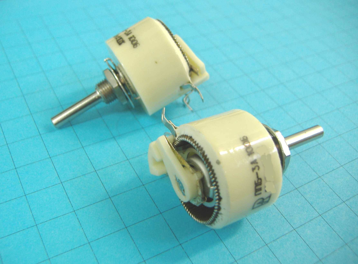 ППБ-3А-3вт 6.8 резистор переменный проволочный бескаркасный регулировочный для навесного монтажа, одинарный, однооборотный с круговым перемещением подвижной системы и вариантом исполнения вала типа "А". Предназначен для работы в электрических цепях постоянного и переменного токов частотой до 1000 Гц.